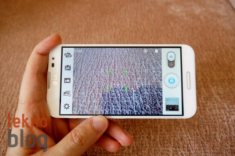Kamera uygulaması çoğu Android telefonunda alıştığımız bir kullanıcı arayüzüyle karşımıza çıkıyor. Ancak bazı unsurlar bakımından geri kaldığını söyleyebiliriz. Örneğin diğer telefonlarda fotoğraf ve video çekim tuşlarının ayrı ayrı olacak şekilde tek bir ekrana yerleştirildiğini görüyoruz, ancak LG Optimus G Pro’da fotoğraf ve video çekim işlevleri arasında geçiş yapmayı sağlayan bir anahtarın ekranın sağ üst köşesine yerleştirildiğini görüyoruz. Bunun dışında büyük bir çekim tuşu, sol kenara yerleştirilmiş kamera değiştirme, sahne modu, otomatik mod, zaman yakalamalı çekim ve ayarlar kamera uygulamasında yer alıyor. Bu arada sesli komutla çekim özelliği LG Optimus G Pro’nun kamera uygulamasında bulunuyor. Ayrıca Samsung Galaxy S4′te gördüğümüz, ön ve arka kameranın aynı anda kullanıldığı İkili Çekim özelliği hem fotoğraf hem de video çekimi sırasında kullanılabiliyor.